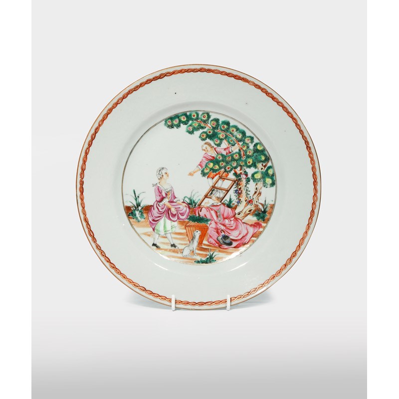 A CHINESE FAMILLE ROSE 'CHERRY PICKERS' PLATE C.1740 Depicting a young man up a ladder passing a...