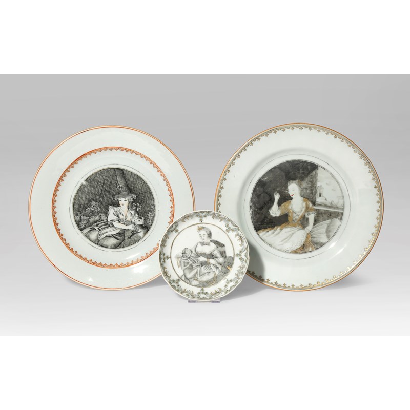 TWO CHINESE EN GRISAILLE PLATES AND A SAUCER C.1750 One plate painted with a seamstress