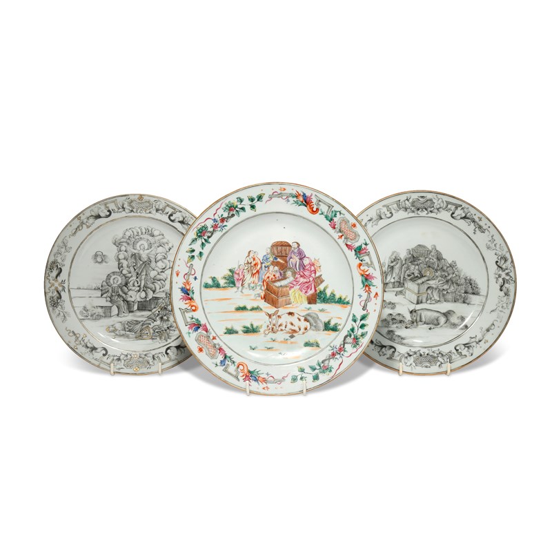 One painted in famille rose enamels with the Nativity, the others decorated en grisaille with a Nativity scene and the Resurrection of Christ, 23cm. (3)