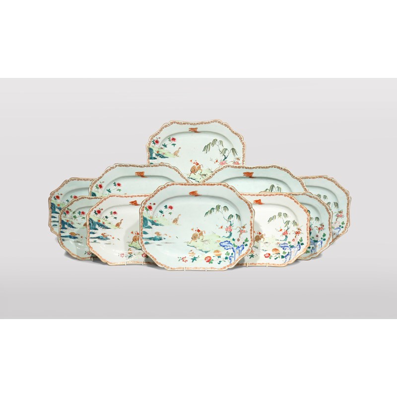 A SET OF TEN CHINESE FAMILLE ROSE CHAMFERED RECTANGULAR MEAT DISHES 18TH CENTURY Painted with...
