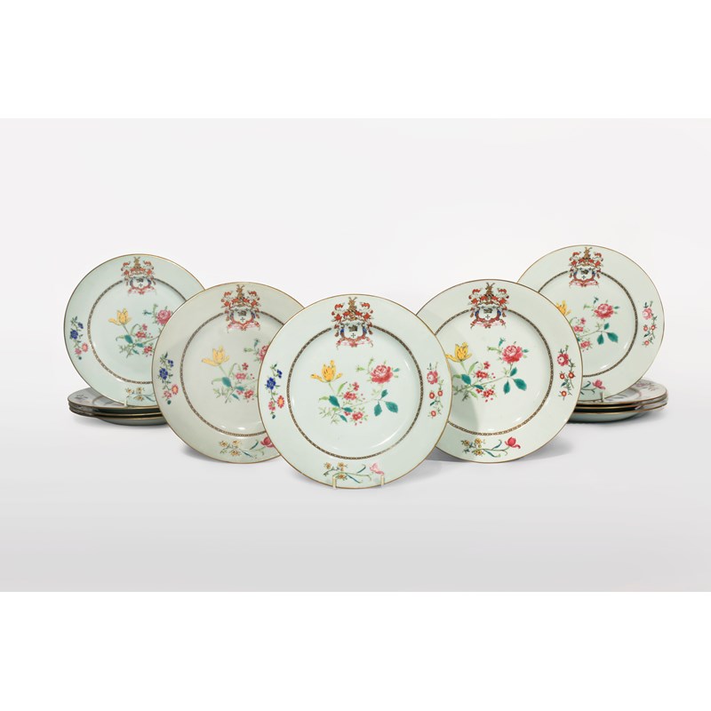 A SET OF ELEVEN CHINESE FAMILLE ROSE ARMORIAL PLATES C.1750 Painted in enamels and gilt with the...