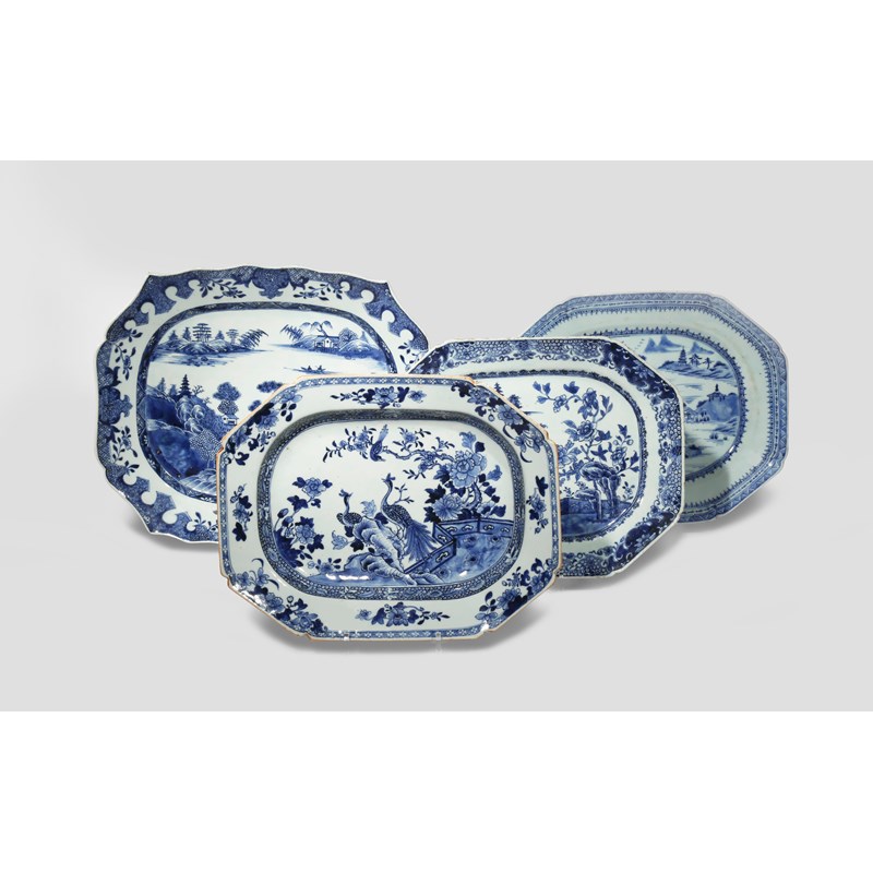 THREE CHINESE BLUE AND WHITE DISHES AND A TUREEN STAND 18TH CENTURY Variously painted with birds