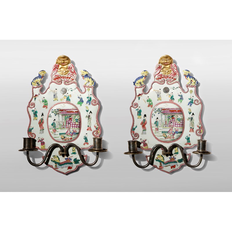 A PAIR OF SAMSON FAMILLE ROSE WALL SCONCES 19TH CENTURY Each painted with a panel containing...