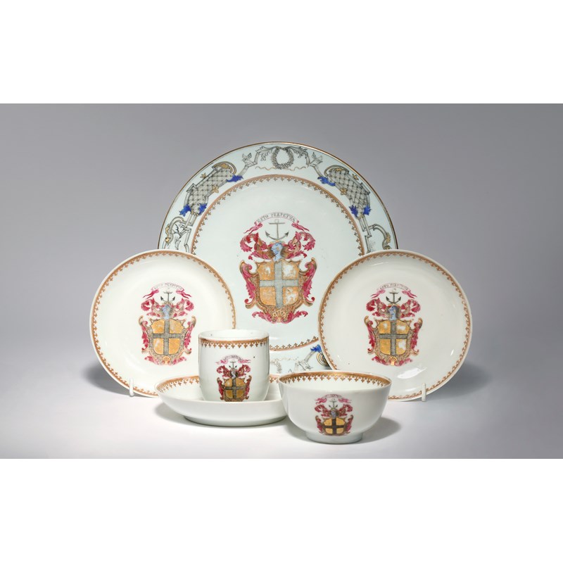 Comprising: a plate, three saucers, a tea bowl and a coffee cup, each bearing the arms of Rait or Rhet of Holgreen and Drumnager, the motto reading 'ESTO PERPETUA', decorated in famille rose, grisaille and blue enamel, 22.5cm. (6)