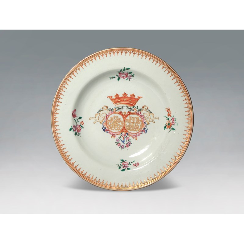 A CHINESE ARMORIAL SOUP PLATE 18TH CENTURY Painted to the well with two angels and a pair of...