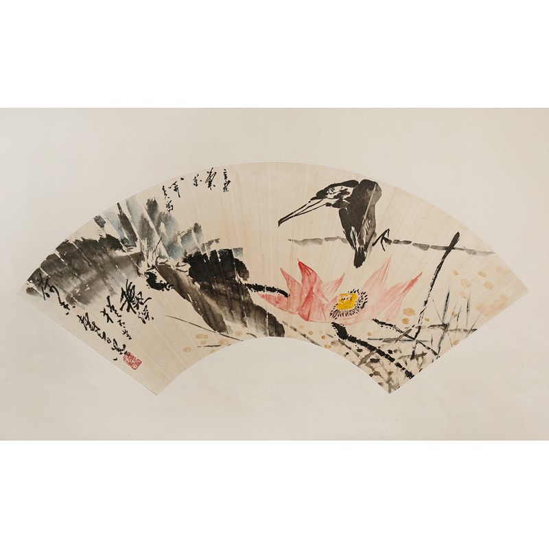 Three Chinese fan paintings, one attributed to Xu Beihong, inscribed and signed Beihong with one artist's seal, another attributed to Pan Tianshou, painted with an aquatic bird, dated and signed Pan Tianshou, the third inscribed, signed by Wang Yu, dated yi mao year, 52cm across. (3)