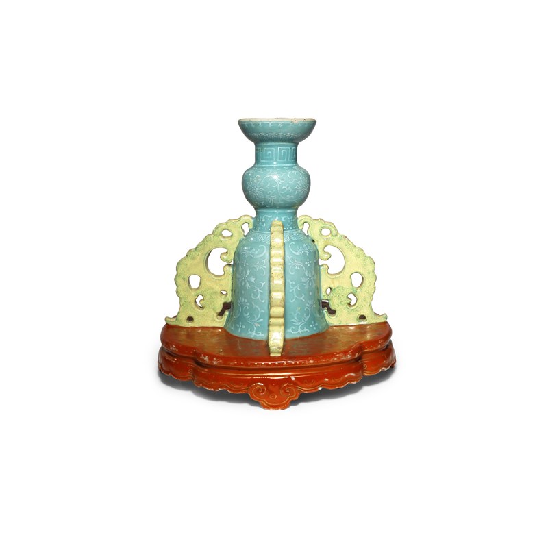 The tall central section painted in white enamel with stylised lotus flowers and bats against a turquoise ground, with four yellow pierced flanges shaped as archaistic mythical beasts, the quatrefoil base moulded with ruyi-shaped feet, decorated in gilt with further lotus sprays on a bright iron-red ground, 17.5cm.