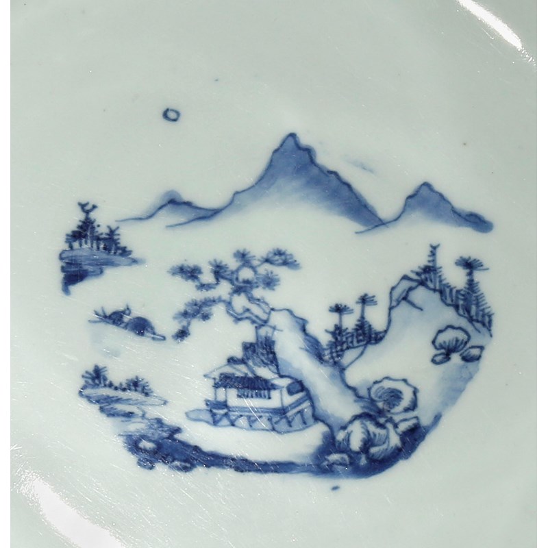 Painted in enamels and gilt with two large cartouches enclosing lovers in an amorous embrace, the scenes divided by smaller flower-shaped panels containing pairs of birds in flight amongst peony and rockwork, all surrounded by flowerheads set amidst foliage in underglaze blue, the interior with a mountainous landscape beneath a continuous floral scroll, the base with a paper label for the Hervou‡t Collection, no.193, 26cm.