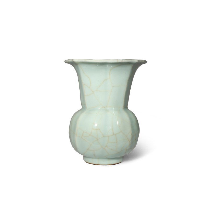 The lobed compressed circular body surmounted by a tall neck and flared foliate rim, the interior and exterior both covered with a pale blue crackled glaze, the base with a paper label for the Seligman collection, 18.3cm.