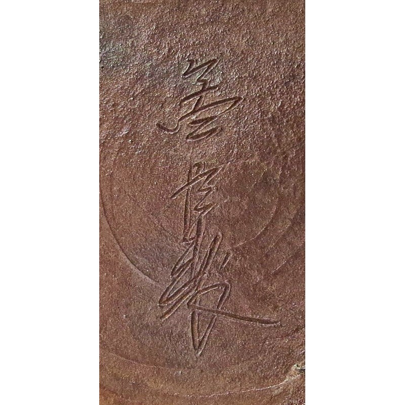 With a compressed circular body, the stoneware a dark brown tone, the base with a three character signature which reads Meng Chen zhi, 11.5cm. (2)