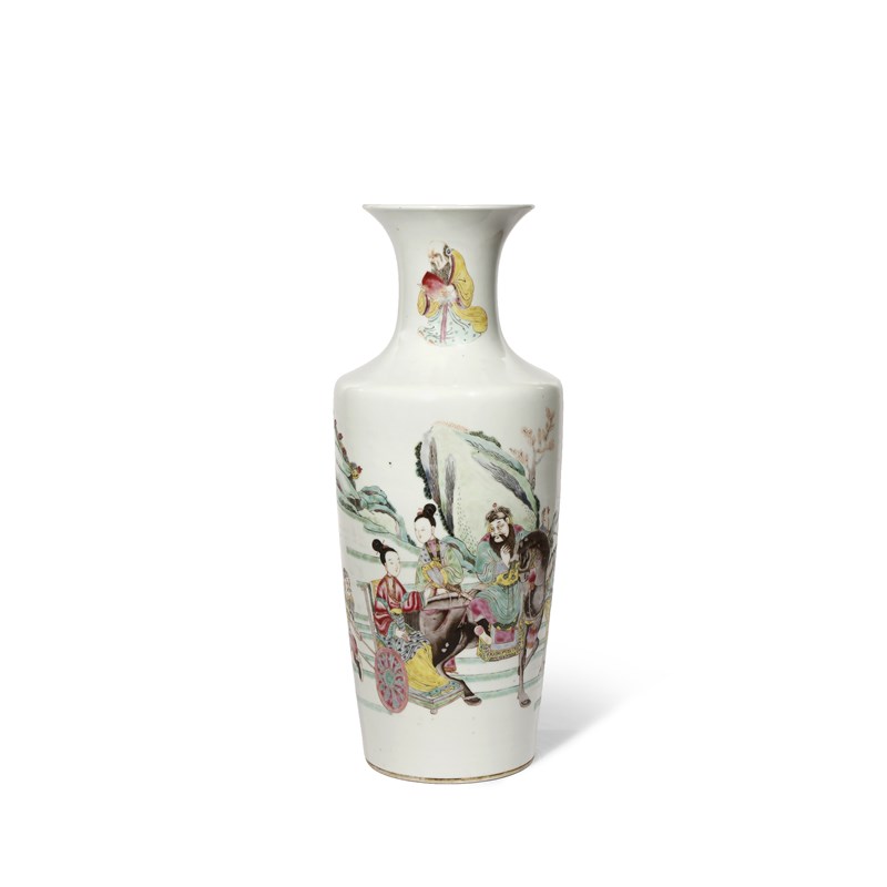 The exterior decorated in coloured enamels with Zhong Kui on horseback taking his sister through a rocky landscape to be married to his friend Du Ping, with attendants around them, the waisted neck painted with Shoulao holding a peach and two seal marks, 43.2cm.
