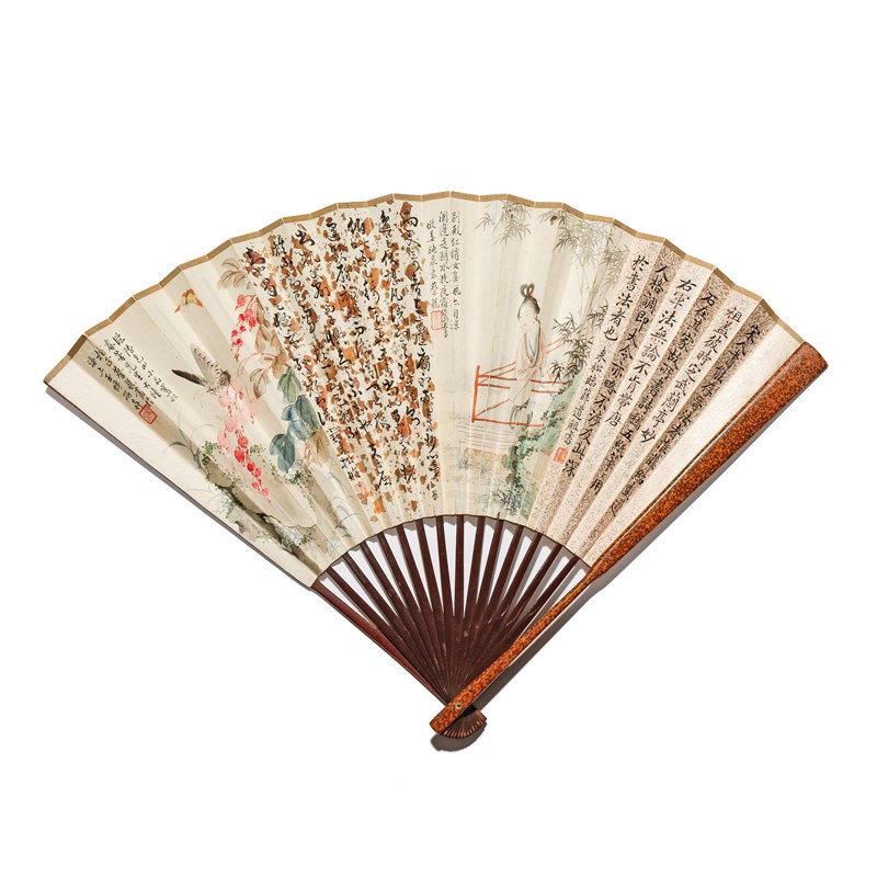 A Chinese xipi lacquer fan, ink and colour on paper, each side with extensive inscriptions signed by Zhong Laisong with his four seals, dated wu yin year, painted and signed by Cai Xian with five artist's seals, 47.5cm across.