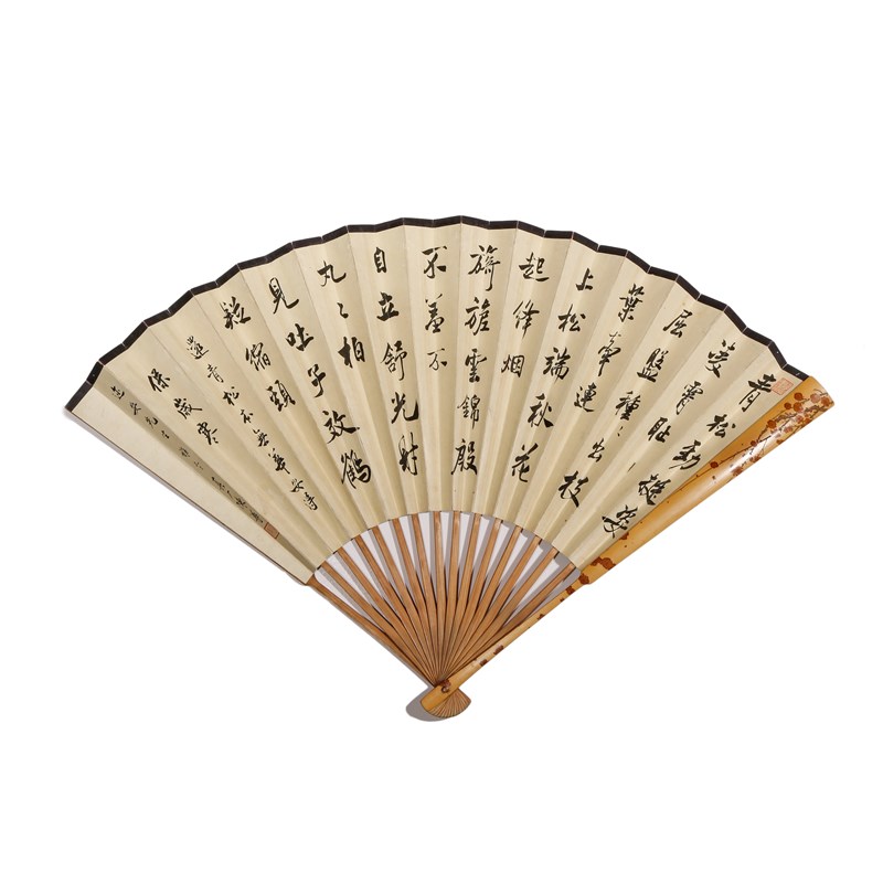 A Chinese spotted bamboo fan, painted to one side with a pine tree, signed and dated wu zi year (1948) with an artist's seal, the other side with an extensive inscription, also signed with an artist's seal, the markings of the bamboo used to depict blossoming trees, 64cm across.