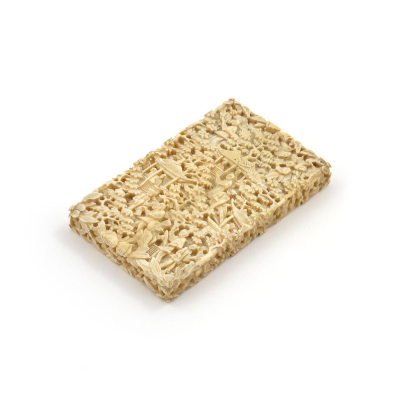 λ A Chinese Canton ivory card case 19th century, typically carved in relief with figures engaged in daily pursuits amidst pine and pavilions, 9.5cm. (2)