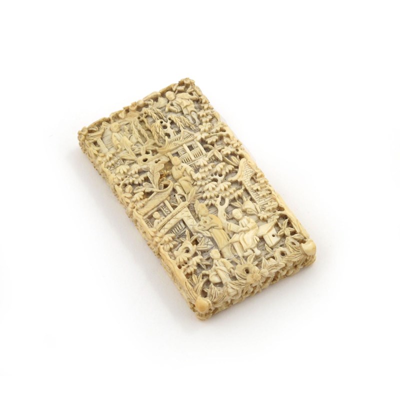 λ A Chinese Canton ivory card case 19th century, typically carved in relief with figures engaged in everyday pursuits, amidst pavilions, pine, plantain and willow, 8.5cm. (2)