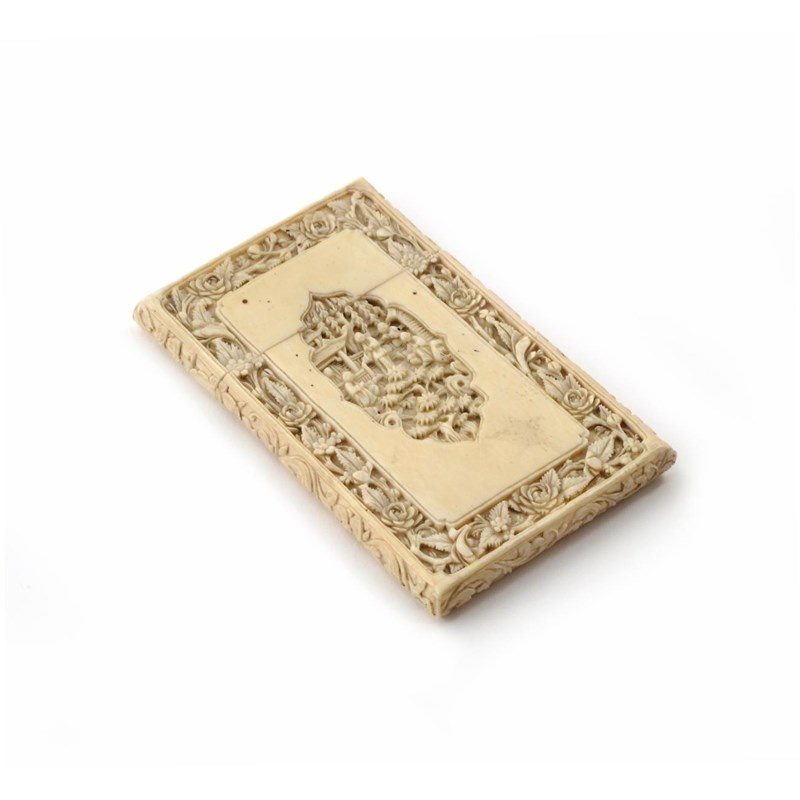 λ A Chinese Canton ivory card case 19th century, carved in relief with panels containing peony and scrolling foliage, each side with a central cartouche containing small figures amidst pine and willow before pagodas, 10.7cm. (2)