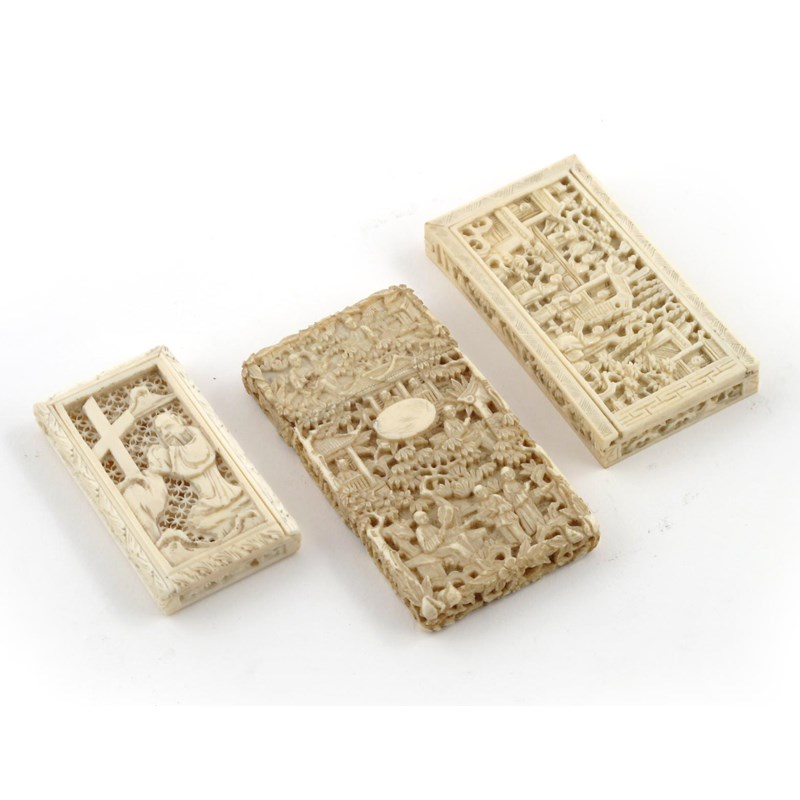 λ Two Chinese Canton ivory puzzle boxes 19th century, each with a sliding cover, together with a carved ivory card case, all depicting figures in various landscapes and pursuits, the card case with a vacant cartouche, 9cm max. (4)
