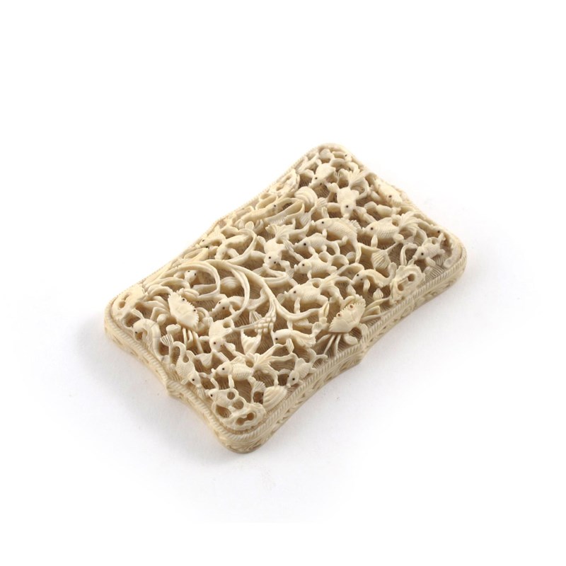λ A Chinese Canton ivory card case 19th century, one side carved in high relief with fish, crabs and other crustacea, the reverse with a panel of figures beneath a tree, 10.5cm. (2)