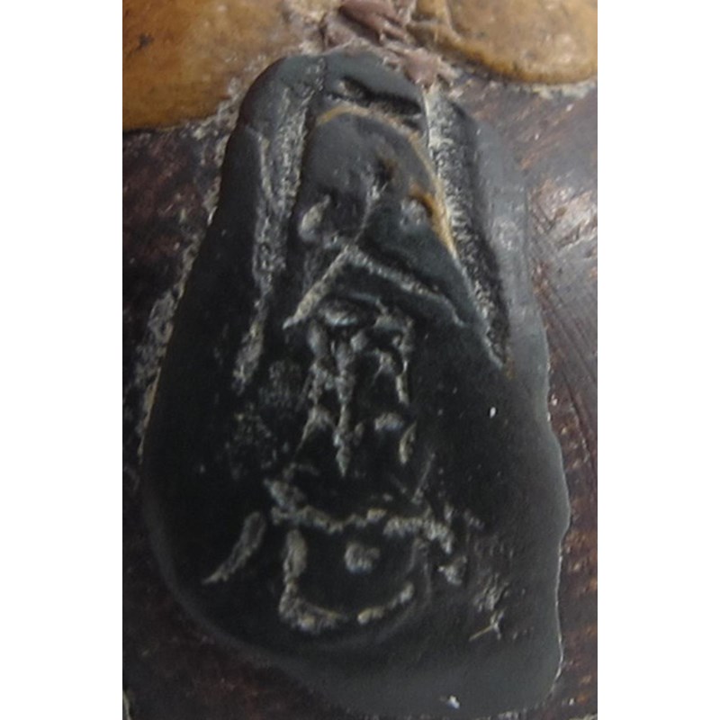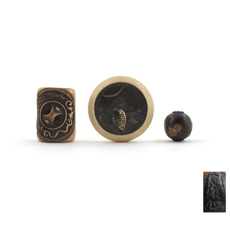 λ A Japanese stag antler hako netsuke 19th century, Kokusai school, carved with a circular mirror to one side in Asakusa style, an ivory kagamibuta decorated with a minogame and an ojime decorated with rice bails and gourds, 4cm. (4)
