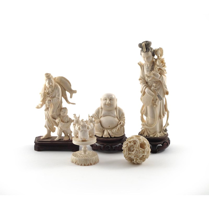 λ A Chinese carved ivory puzzle ball and stand early 20th century, an ivory carving of a maiden holding a flower bloom, another of a fisherman, the third of Budai He Shang, 23.5cm.(5)