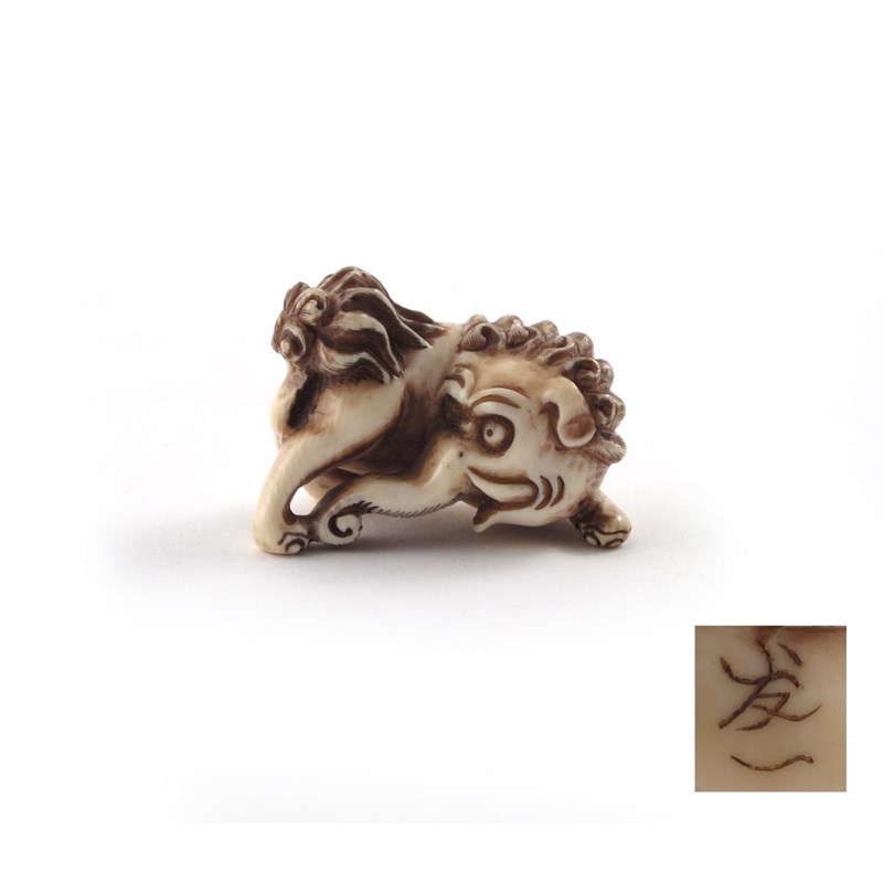 λ A Japanese ivory netsuke of a baku 19th/20th century, crouching down with its tail raised, signed to the reverse, 4.3cm.