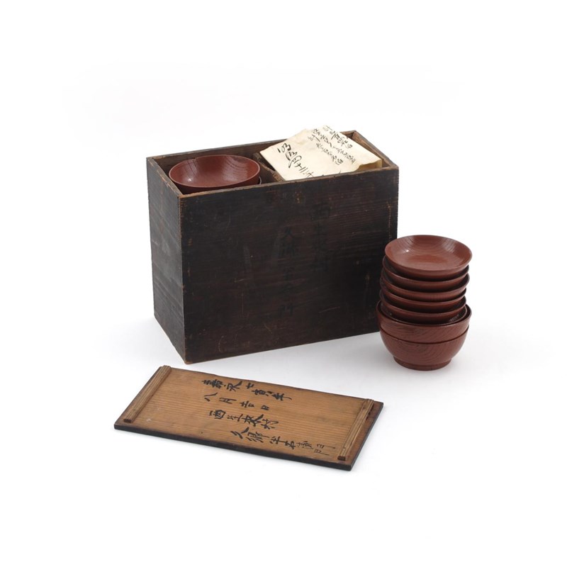 Ten Japanese red lacquer bowls 19th century, and ten of shallower form, each lacquered black to the footrim, the compressed circular body raised on a short straight foot, contained in a fitted wooden box, 11.4cm dia. (22)