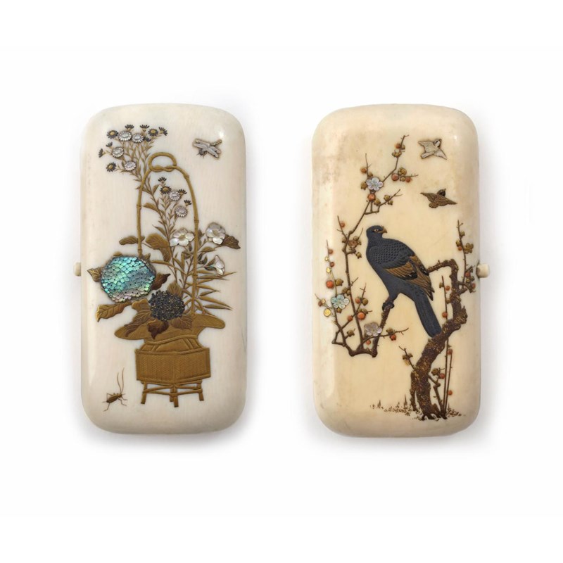 λ A Japanese Shibayama sewing box and cover Meiji 1868-1912, onlaid in mother of pearl with a jardinière of flowers and a dragonfly to one side, and an eagle perched on a prunus branch to the other, the interior fitted with sewing instruments, 11.4cm.