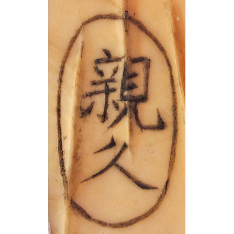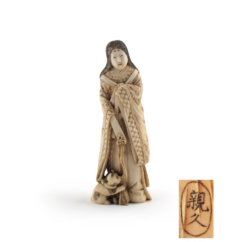 λ A Japanese ivory figure of a girl 19th century, with long hair secured in a loose ponytail, her robes with a floral scrolling design, a small cat playing with a ribbon at her feet, the base with a two character mark, 10.8cm.