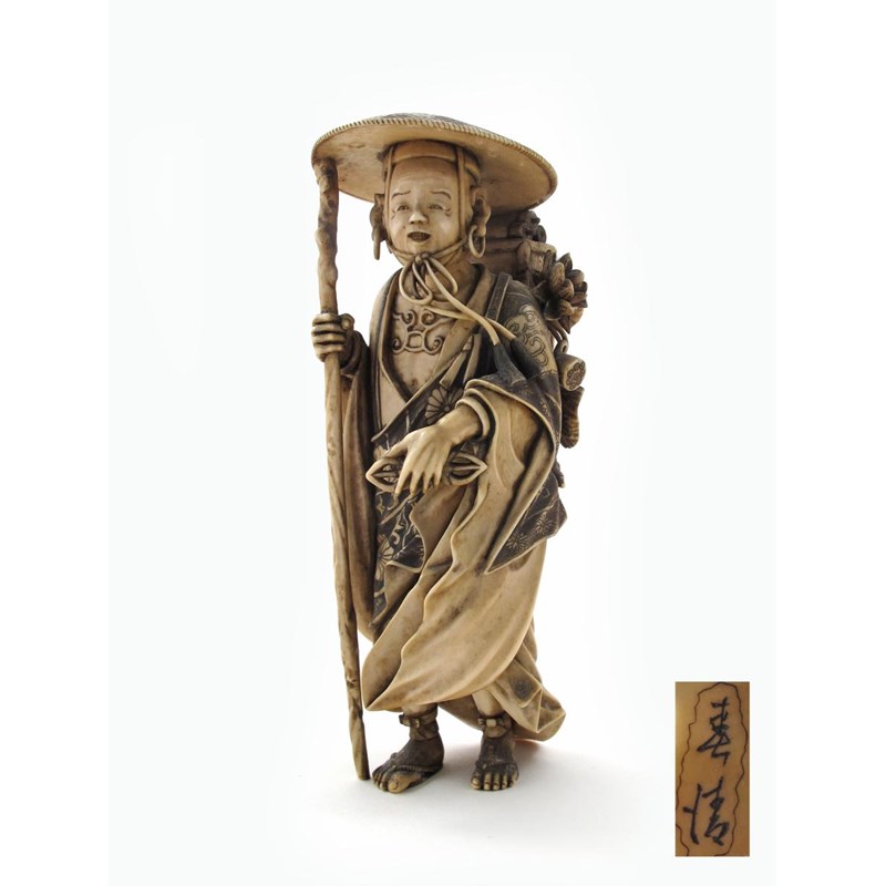 λ A good Japanese ivory okimono Meiji 1868-1912, depicting an itinerant priest with a straw hat, a gnarled staff and floating robes, holding a kongo and carrying a portable shrine, lotus flowers and makimono on his back, a two character mark to the base, 12.8cm.