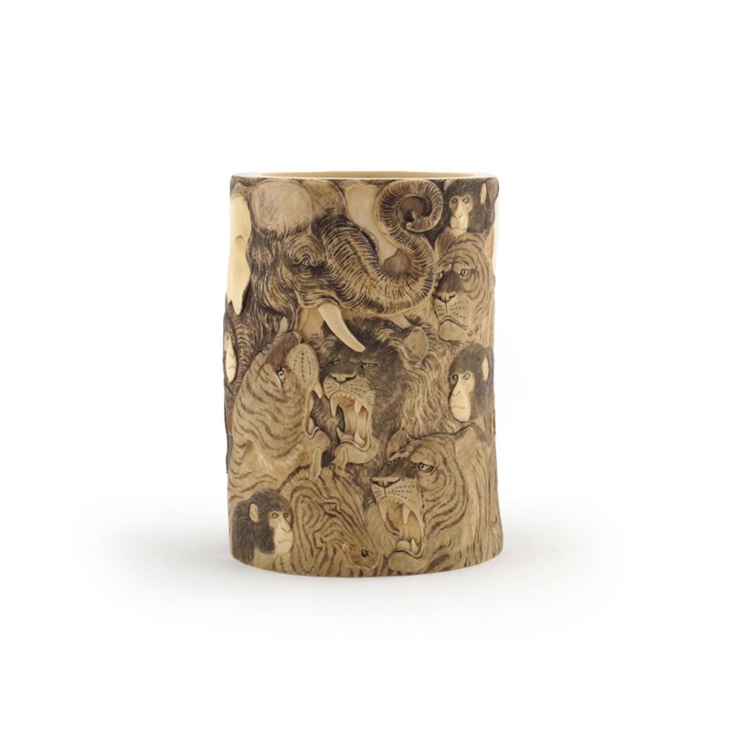 λ A Japanese ivory brush pot 19th century, carved in relief with elephant, tigers, monkeys, lion and zebras, the beasts' features finely defined, a beetle carved to the interior and base, 15.8cm.