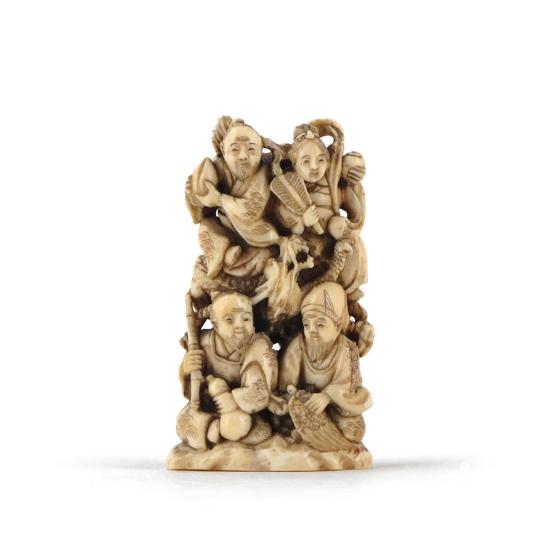 λ A Japanese marine ivory okimono Meiji 1868-1912, depicting six figures clambering upon rockwork, variously clasping a net, a jar, a fan, a large peach and a gourd, with minogame and a scaly dragon, a two character mark to the base, 9.3cm.