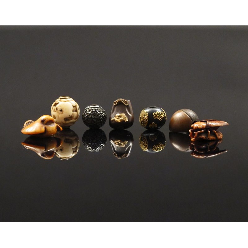 λ A group of seven Japanese ojime 18th and 19th century, including one of Fukura-Suzume the lucky sparrow, one an ivory cicada, one of Usofuki and one in gold and shakudo with stylized pawlonia mon, 2.1cm max. (7)