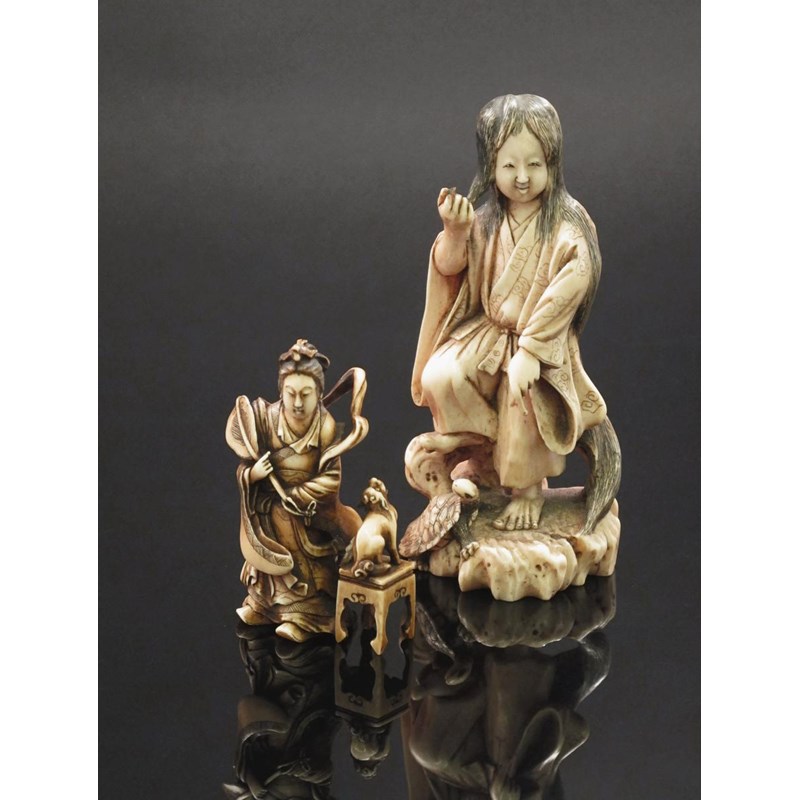 λ Two Japanese ivory okimono 19th century, one of goddess Seiobo with a fan, signed Hideshika, the other of Urashima Taro and the tortoise, the former with label from the Tomkinson collection, 11.2cm. (2)