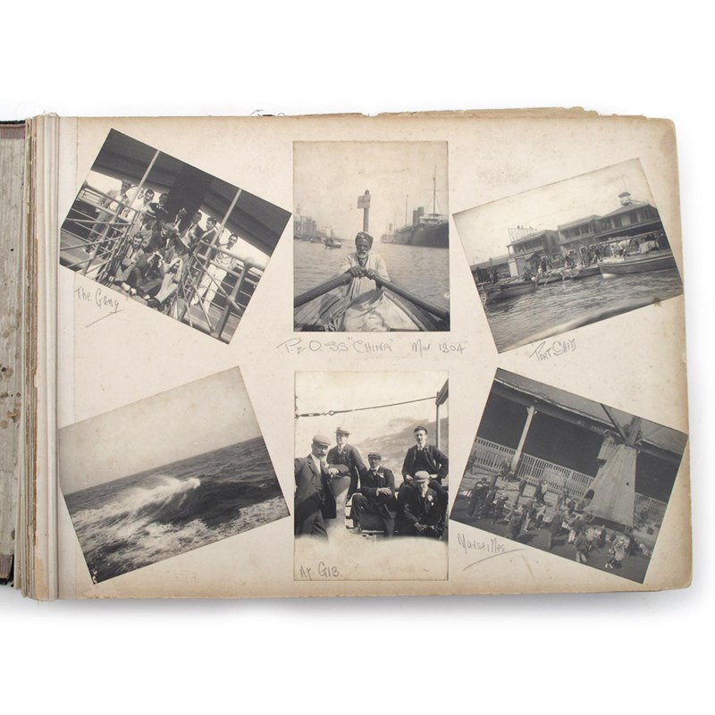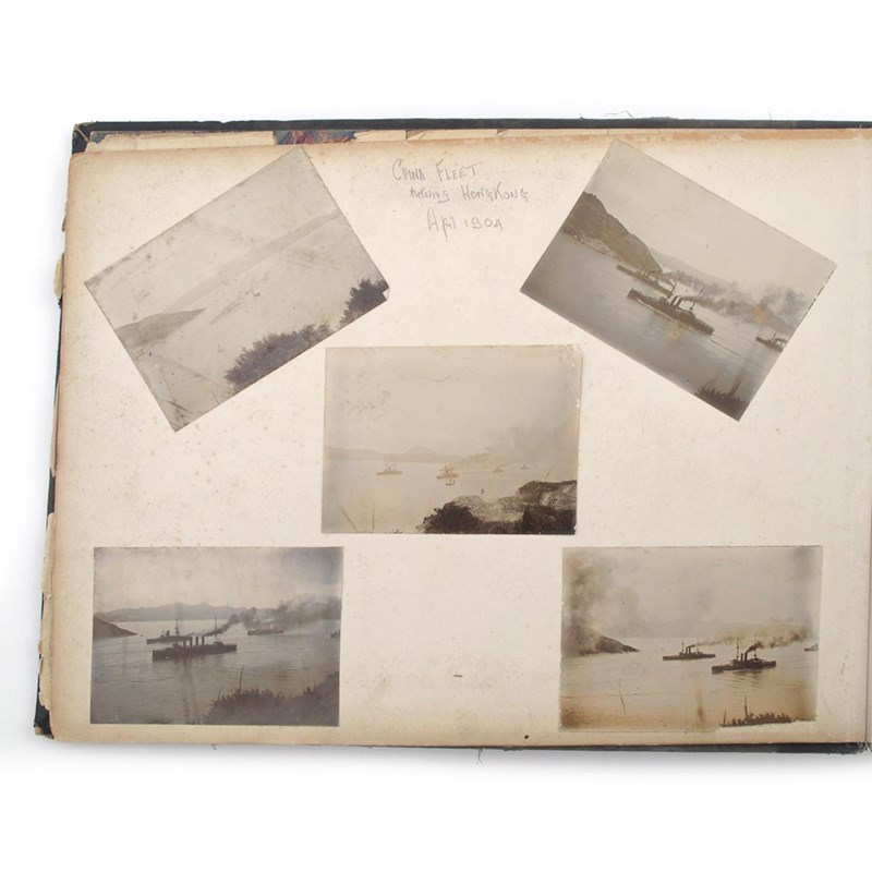 An album of photographs from Hong Kong and Macau by Ernest Pellow dated 1904, depicting scenes of the China fleet, The Peak and other panoramas, mounted on card leaves, most 9cm x 12cm. (approx. 181 photographs)