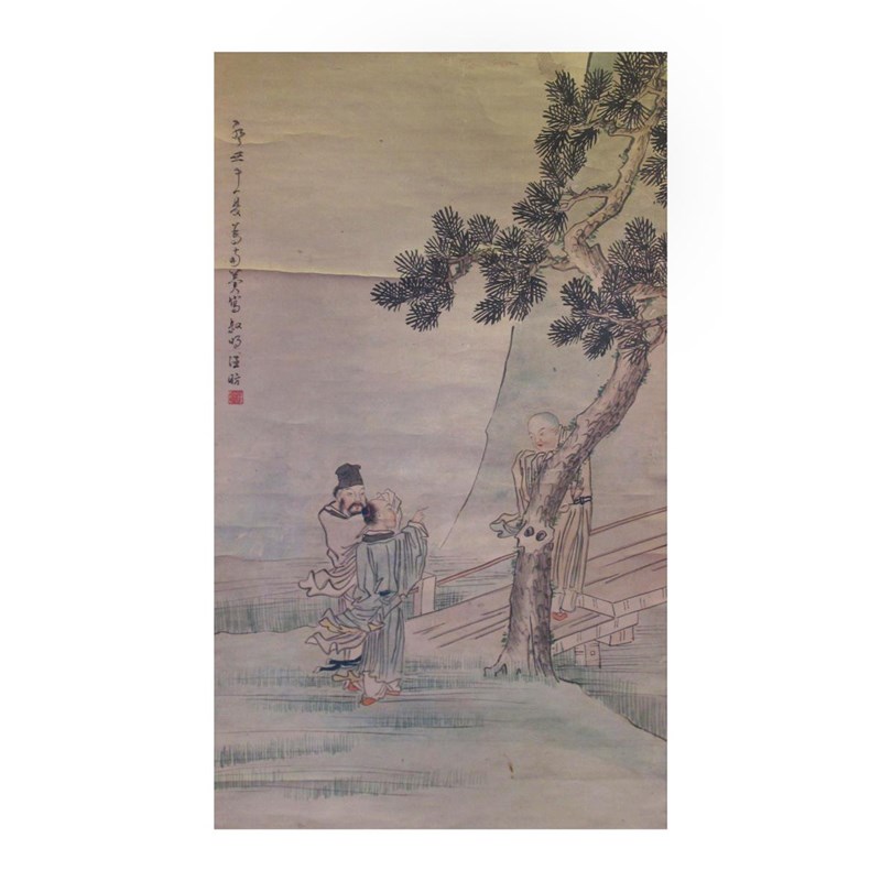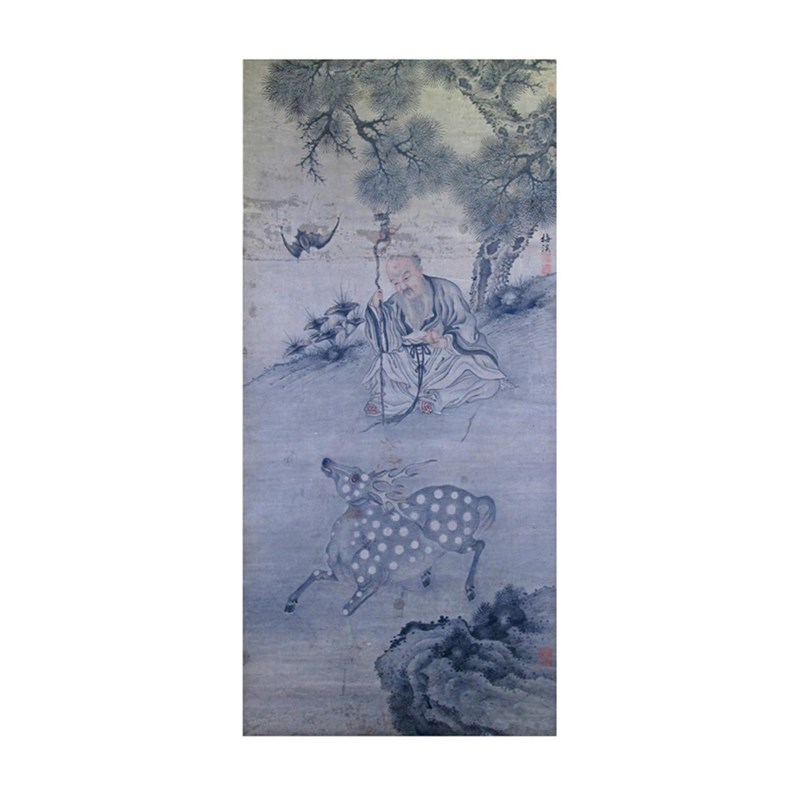 Two Chinese scroll paintings 19th/20th century, one depicting Shoulao seated beneath a pine tree with a bat, a deer and a lingzhi spray, signed Mei Xi, and with four artists' seals, the other with three figures beneath a pine tree, a column of calligraphy and a single seal, 135cm x 61cm and 106cm x 60cm respectively. (2)
