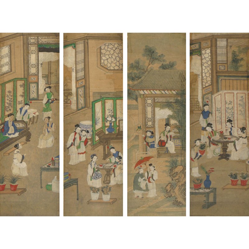 Four small Chinese scroll paintings 19th century, depicting figures engaged in various pursuits in interiors and gardens, 64cm x 21cm. (4)