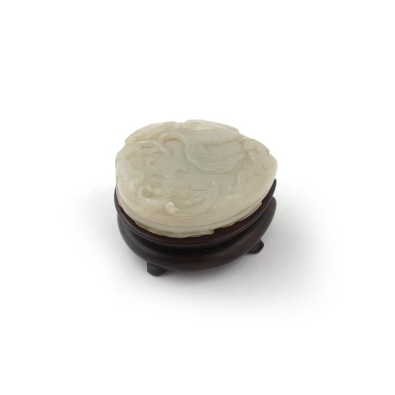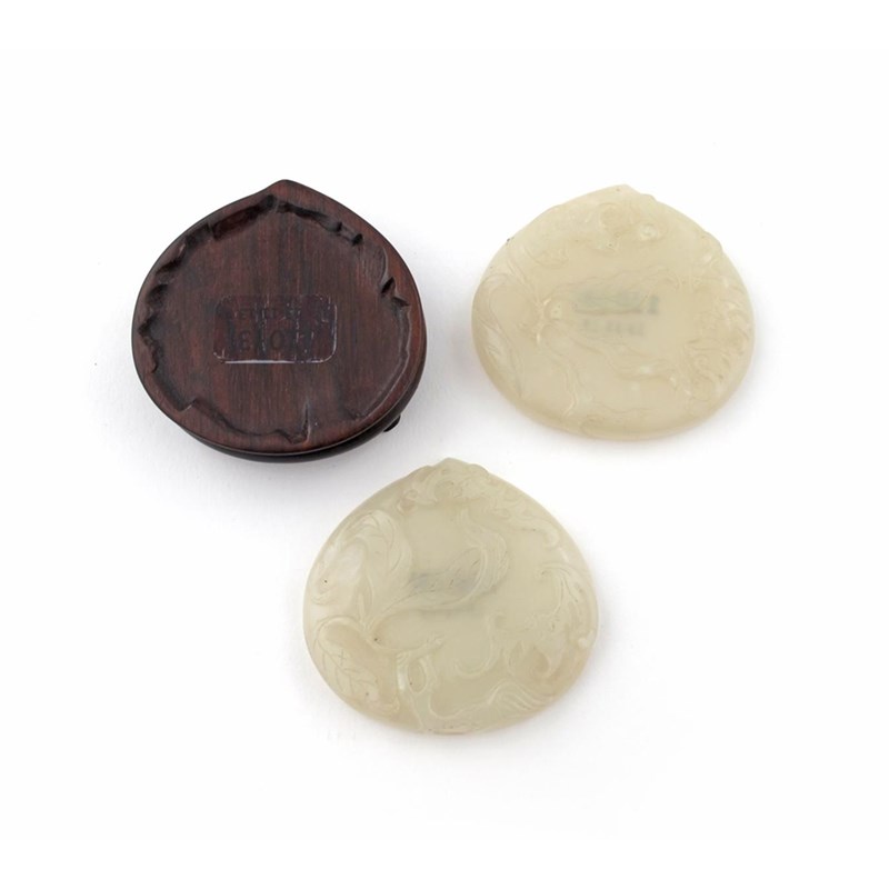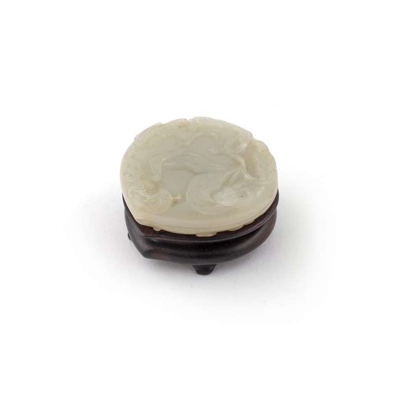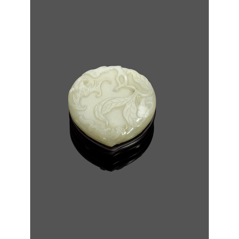 A rare Chinese pale celadon jade snuff box and cover Qianlong 1736-95, formed as a peach and finely carved to each side with a leafy branch issuing from the stem, and with two bats clambering upon the fruit with outstretched wings, a fitted hardwood stand, 5.4cm. (3)