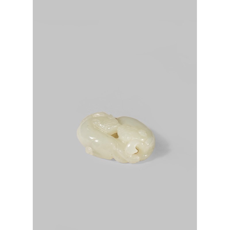 A CHINESE PALE CELADON JADE CARVING OF TWO LION DOGS 19TH CENTURY Formed as a pair of coiled...