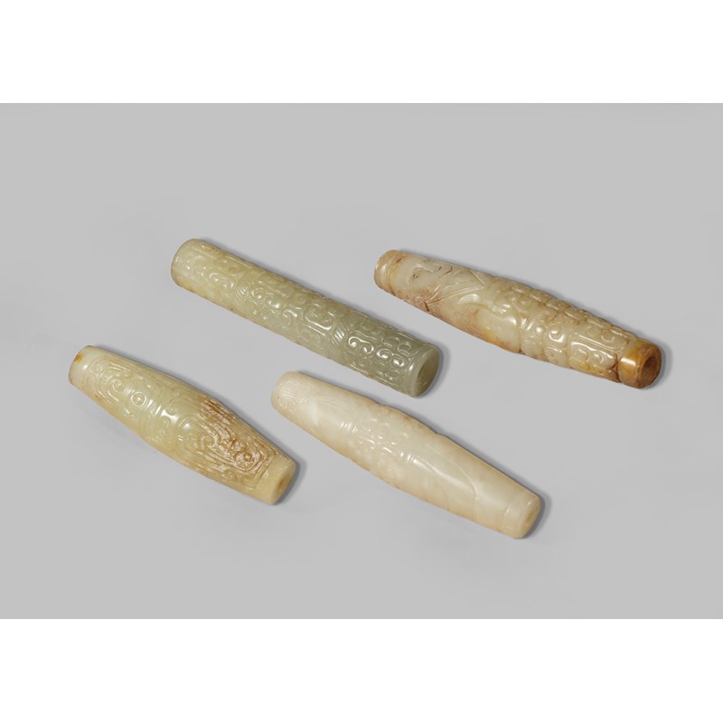 FOUR CHINESE CELADON JADE ARCHAISTIC CYLINDRICAL BEADS MING DYNASTY OR LATER Carved with...