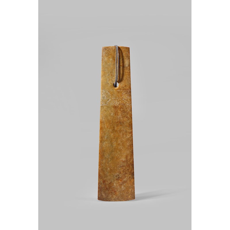 A CHINESE NEOLITHIC JADE BLADE ZHOU DYNASTY OR EARLIER Of a tapered form in a yellowish stone...