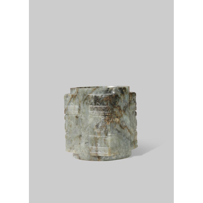 A CHINESE MOTTLED GREY-GREEN JADE ARCHAISTIC CONG