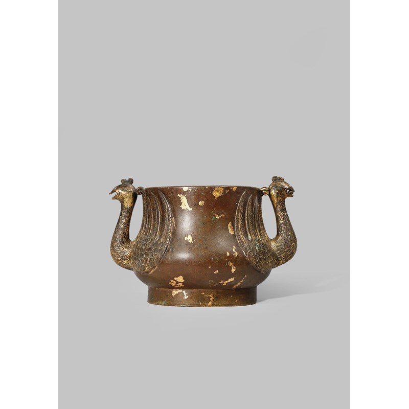 A RARE CHINESE GOLD-SPLASHED BRONZE 'PHOENIX' INCENSE BURNER MING DYNASTY The pear-shaped body...