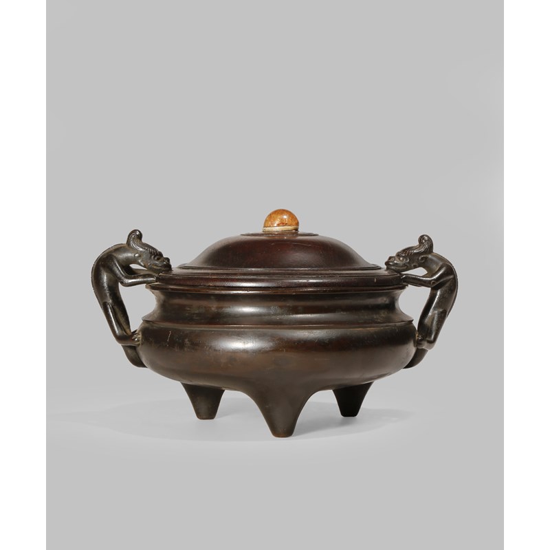 With a compressed circular body and two chilong clambering over the rim forming handles, all supported on three tapering feet, with a six character mark to the base, together with a wood cover with a rock crystal finial, 26cm, 2.8kg. (2)