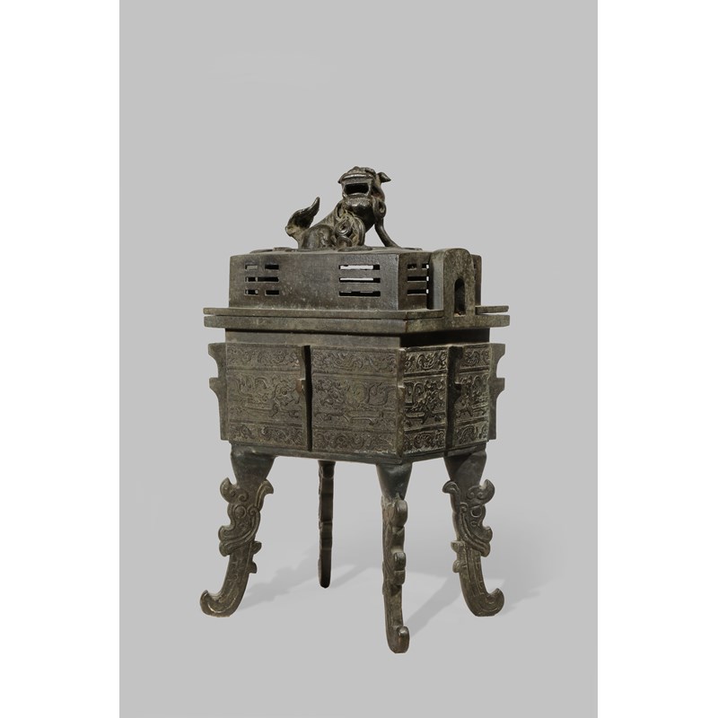 With a rectangular-section body divided by flanges and decorated with taotie masks between zoomorphic bands against a dense key fret ground, with two loop handles rising from the rim, all supported on tall dragon mask-shaped legs, the cover pierced with the eight trigrams and with a lion dog surmount, 44cm 13kg. (2)