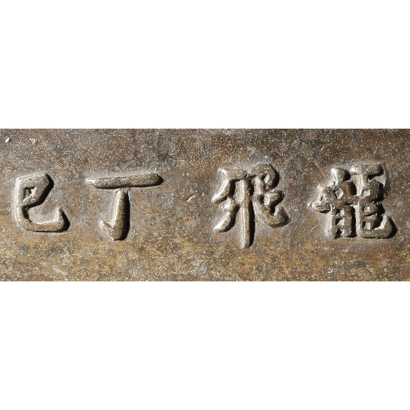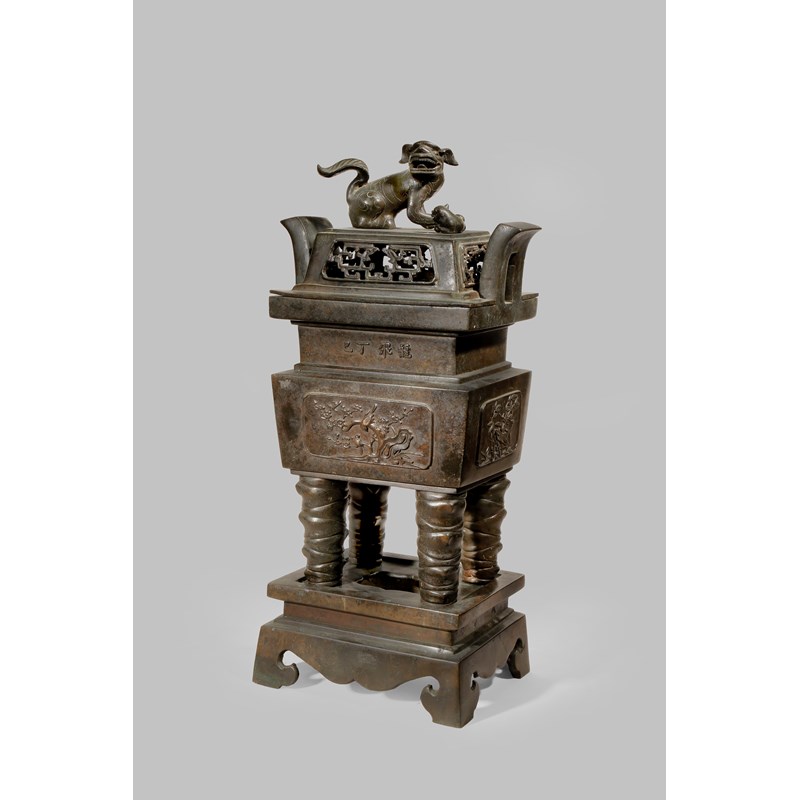 The rectangular-section body decorated with panels containing bamboo, prunus and pine and various animals, with a four character date mark reading long fei ding si to the neck, all supported on four bamboo-shaped legs, the cover with reticulated panels formed as archaistic beasts, surmounted with a detachable lion dog and puppy, together with a bronze stand with four bracket feet, 58cm, 18kg. (4)