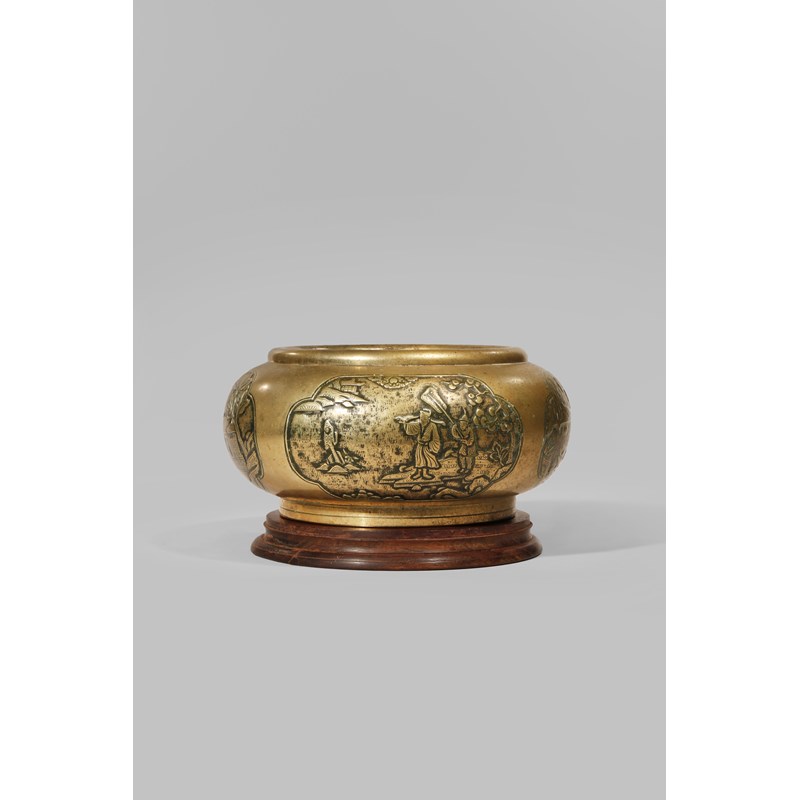 The compressed circular body decorated with four quatrefoil panels with figures in landscapes, with a simple ring around the rim and supported on a circular foot, a four character Xuande seal mark to the base, together with a plain wood stand, 23.5cm, 4.9kg. (2)