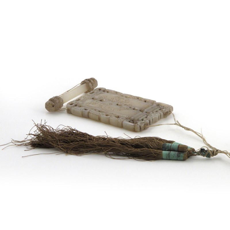 A Chinese celadon jade plaque formed as a conjoined vase and cover 18th/19th century, carved with two scrolls, a dragon to one side and a phoenix to the other, with a band of reticulated cloud scrolls and stylized dragons, an additional bar beneath carved with flowerheads, held together with a silk tassel, minor damage, the plaque 8.6cm. (3) Provenance: William Cleverley Alexander (1840-1916).