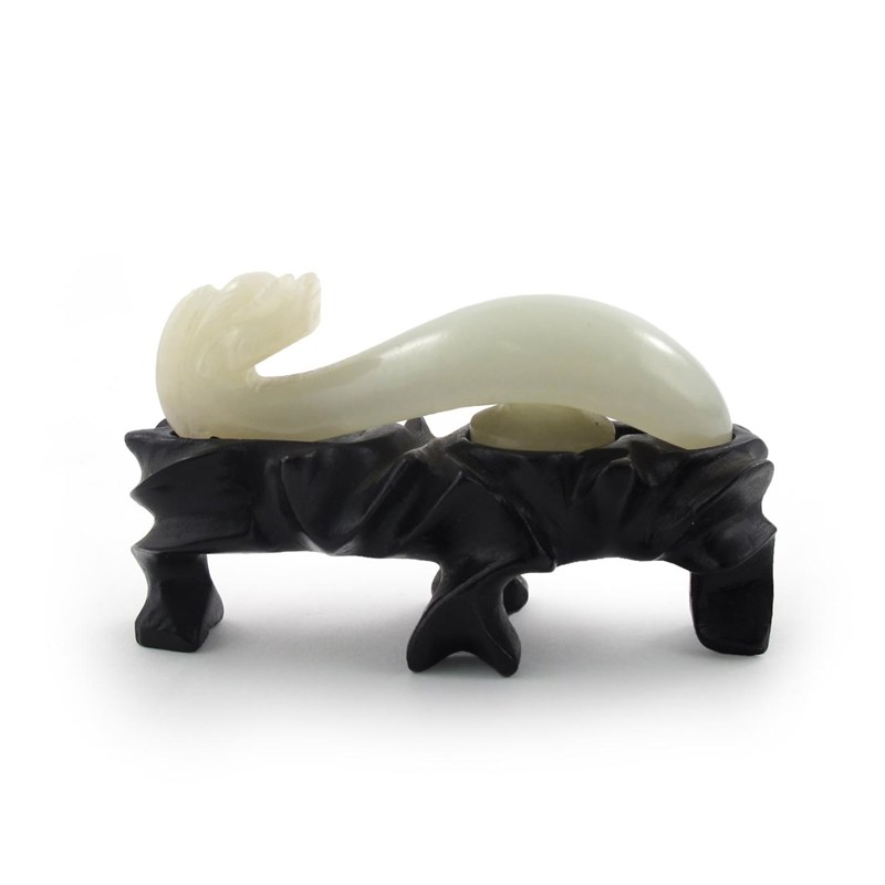 *A small Chinese pale celadon jade belthook 18th century, the hook carved as a horned dragon's head, together with a carved wood stand, 6.2cm. (2)