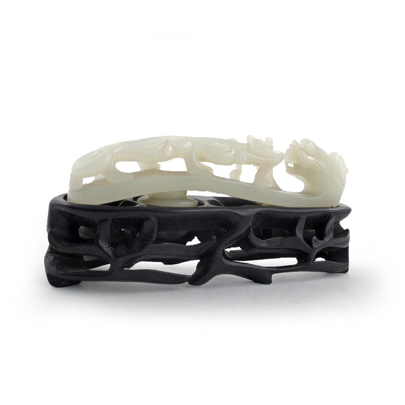 十八世紀 青白玉雕螭龍帶鈎及木底座