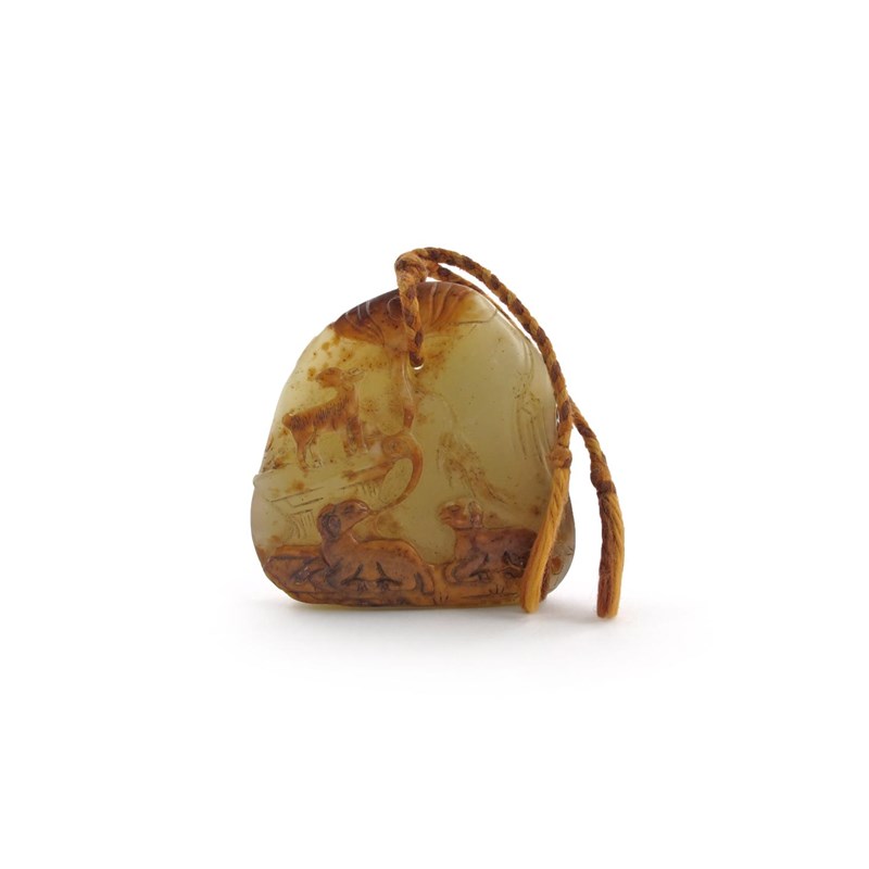 A Chinese yellow jade pendant probably 18th century, one side carved with three mountain goats, the reverse with a pine tree and rocks, the stone with russet markings to the relief, 4.8cm.